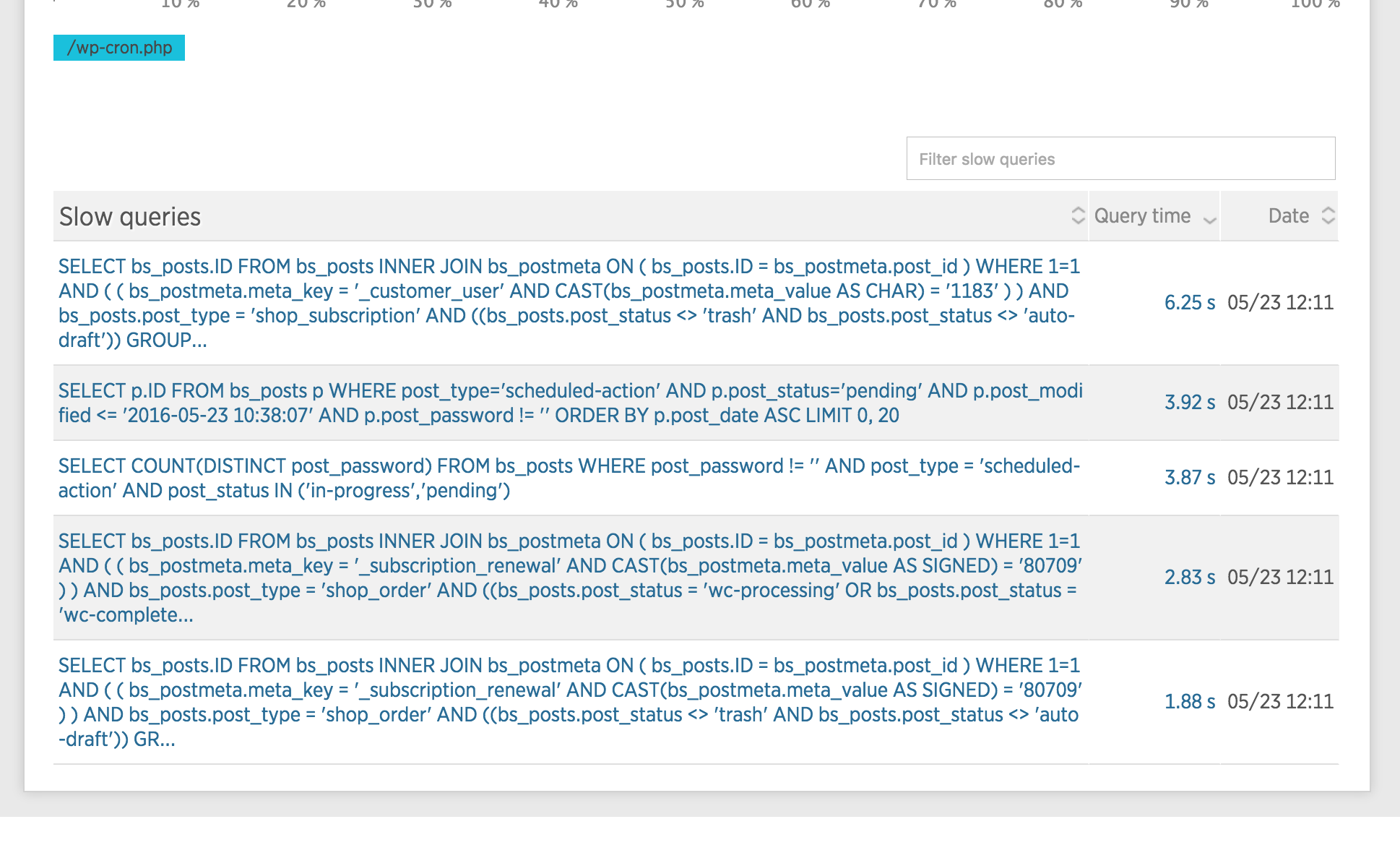 Subscriptions is using a temporary table to query by last payment date. ~2 hour query => 900ms. GHOST_URL/2016/02/22/how-i-improved-a-query-for-our-plugin-by-several-orders-of-magnitude/