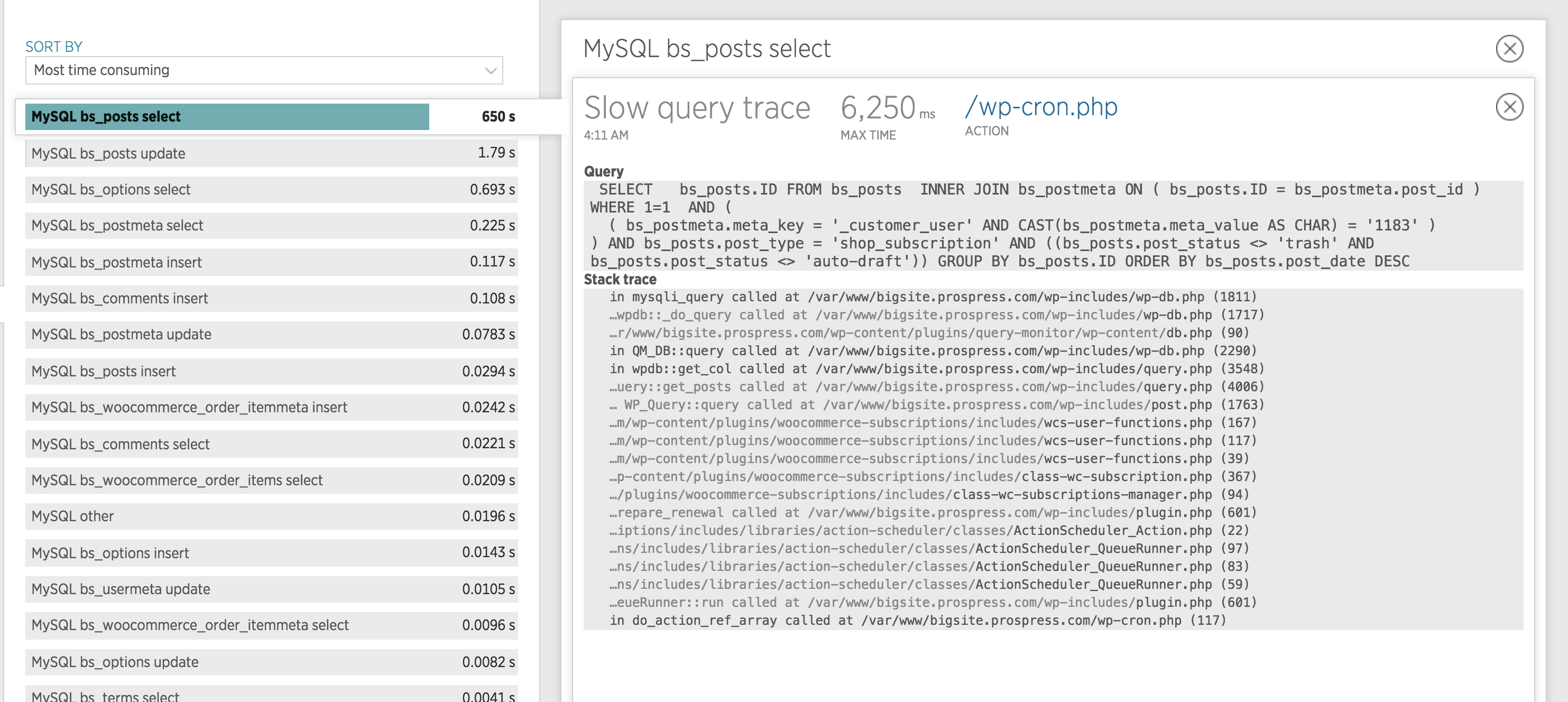 Filtering for time and clicking into the database operations yields the above chart. It’s a SELECT on the posts table. Clicking on that: