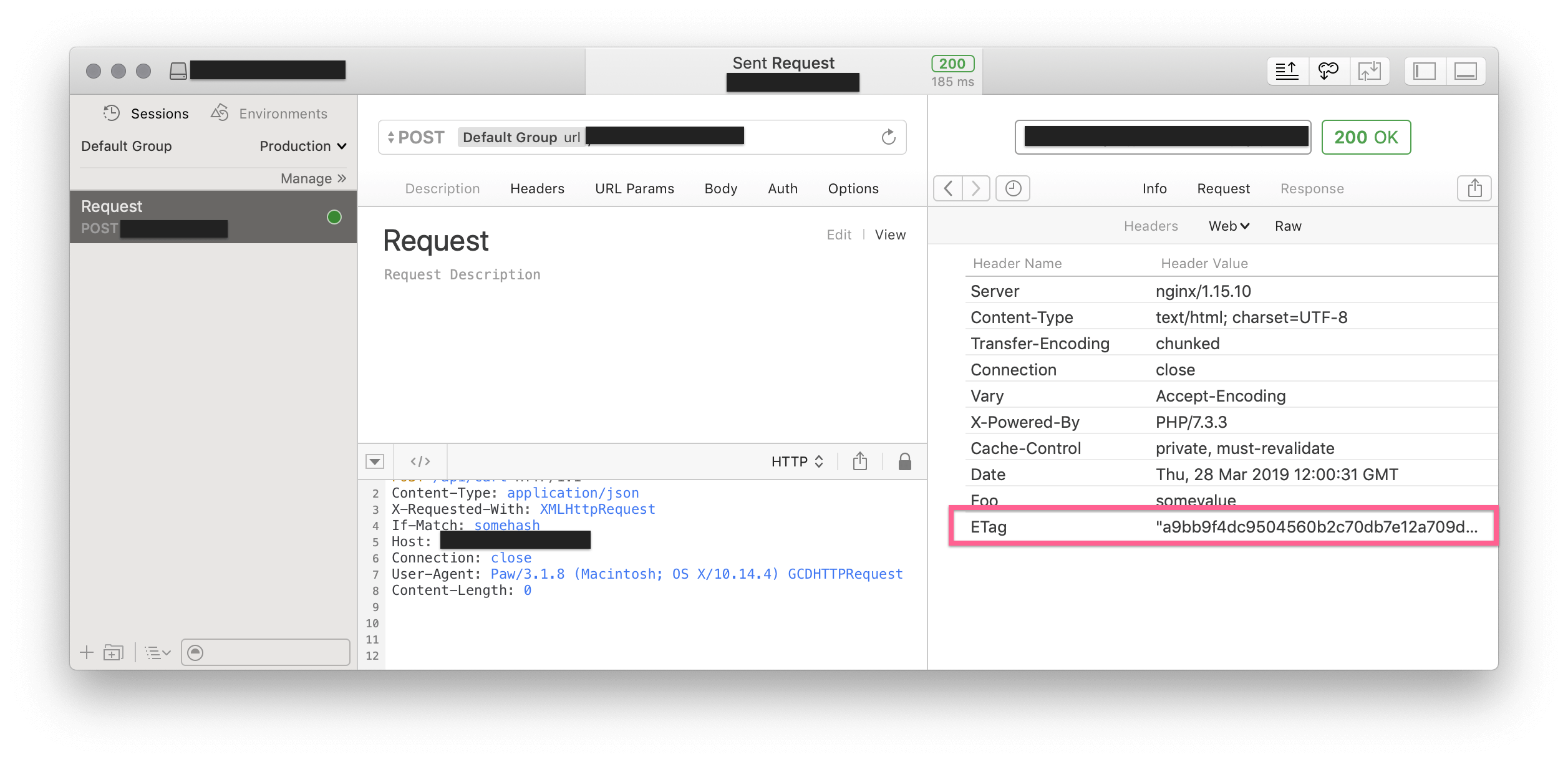 That code also sets the ETag header on the response, and bam, I have access to it! Or at least I should.